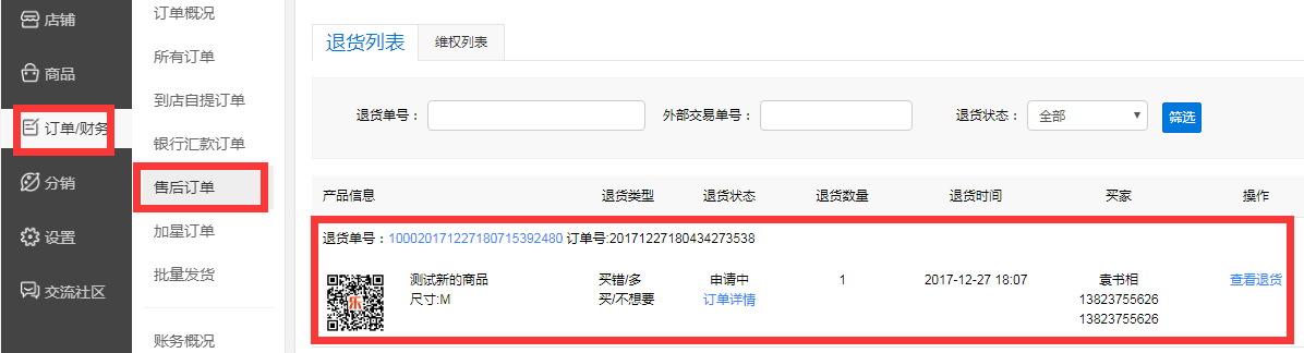 2、选择售后订单,可以对退货订单过行单独管理,也可以查看退货订单的当前状态和退货详细原因等。(下图)