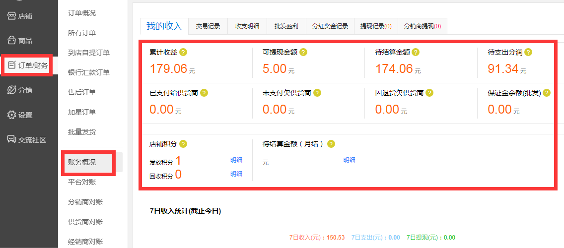 3、选择财务概况按钮,可以查看到当前店铺的财务数据,也可以选择查看平台对账、分销商对账等详细财务报表。(下图)