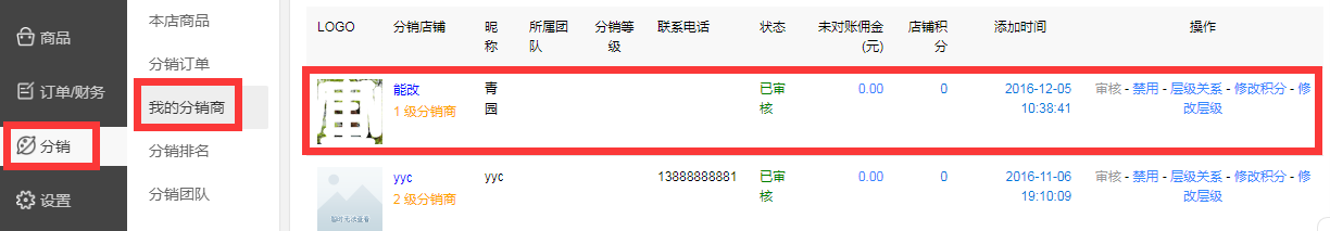 2、当选择我的分销商按钮后,可以查看到当前所有的分销商信息,可以对分销商进行审核与禁用、可以对分销商进行层级关系选择,如分销商没有下级分销者,可以对此分销商进行层级选择。(下图)