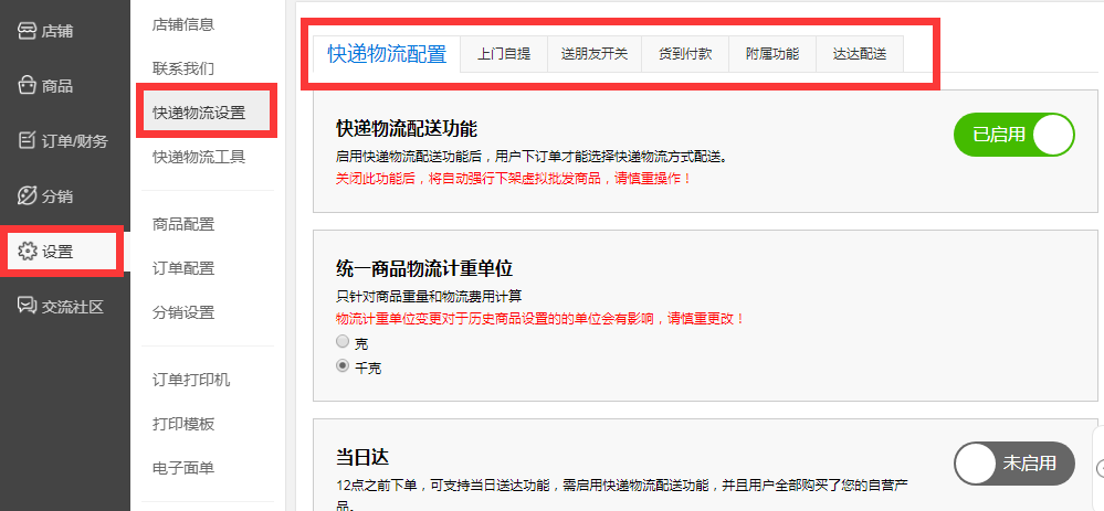 1、左侧导航栏选择设置按钮,在下级栏目中选择快递物流设置,就可以对当前快递配置方式进行开启或关闭选择。具体配置情况请务务根据页面中相关说明操作。(下图)
