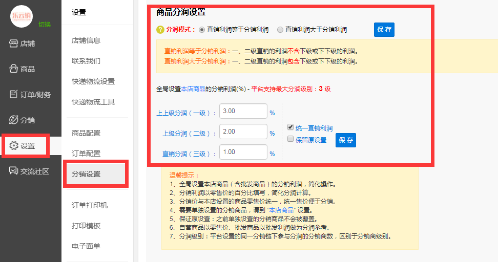 5、选择分销设置按钮后,可以在左则商品分润设置里对不同层级的分销佣金进行利润比设置,具体分润方式、比例金额请务必根据设置页面上的提示说明进行操作。(下图)