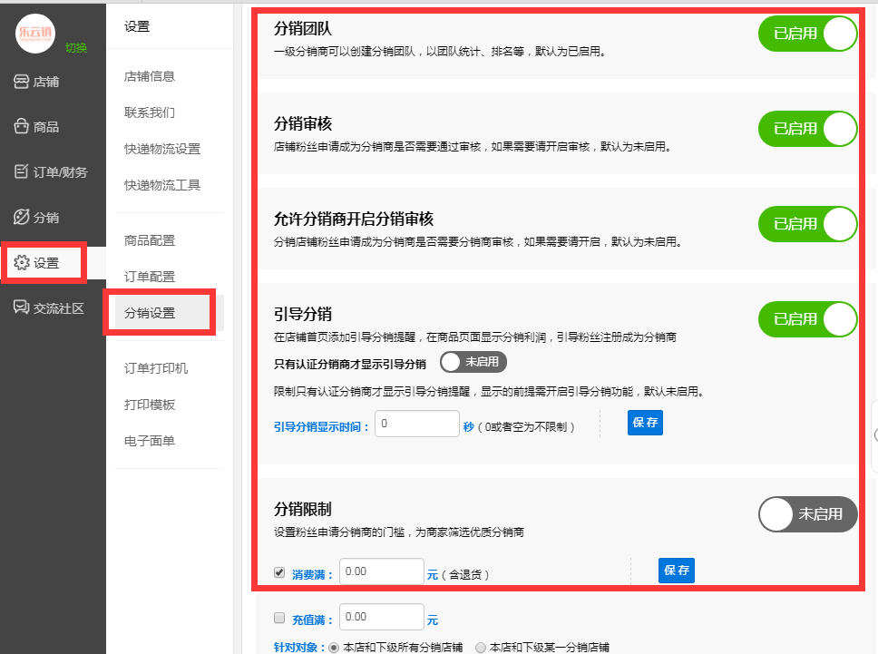 以下为乐云销分销微店创建店铺、店铺页面设计、商品添加发布、财务订单、分销属性管理、店辅主要设置等几个方面做了简单的图文教程,请认真阅读查看,如有页面变化这里不作重复更新,一切以功能后台设置页面的提示说明为准。