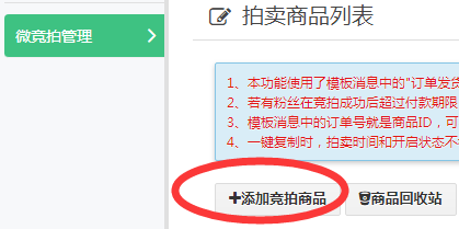 2、进入微竞拍管理后,点击“添加竞拍商品”后便可以创建拍卖活动及被拍卖的商品标的物了。(下图)