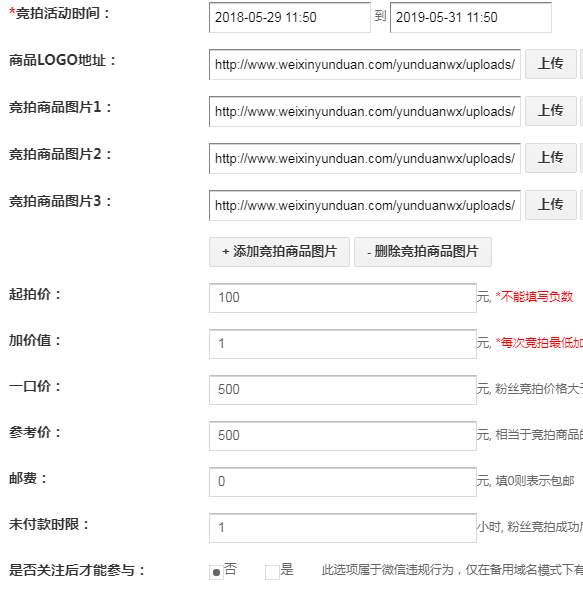 3、在创建竞拍活动时,只需要按设置项目的要求逐条填写完整,同时添加内容时也可以参考设置项目的提示说明,基本上都可以了解到当前设置项目主要的作用是什么了。(下图)
