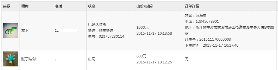 10、当手机端竞拍者正式竞购成功之后,商家可以在活动后台查看竞拍记录,在竞拍记录中便可以看到商品购买者的详细信息,商家根据实际情况完成商品发放即可。(下2图)