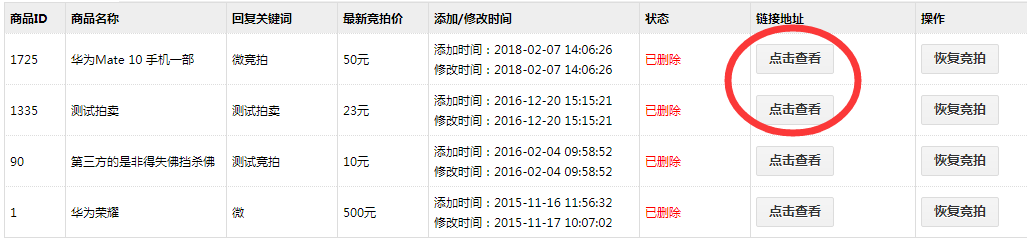 4、当微拍卖活动和商品添加完成后,便可以在活动列表中查看到当前拍卖活动的链接地址,通过链接地址便可以在微信端进入商品竞拍活动了。(下图)