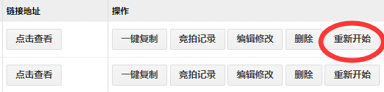 12、如果实际在运营时遇到成交者因某种原因未在规定时间内支付金额的话,那可以通过“重新开始”按钮来开启新一轮的竞拍活动,而之前已经参与过的竞拍出价记录的会被删除清空,若商品时间已结束则自动增加一天时间,可以在修改中重新设置时间。