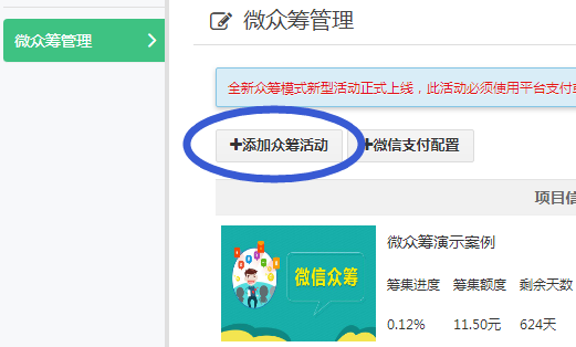 2、进入微众筹功能后,点击“添加众筹活动”这个按钮,就可以正式进入活动添加流程了。平台还允许同时添加多个众筹活动同时候举行开展。(下图)