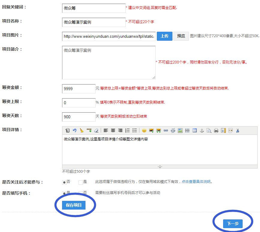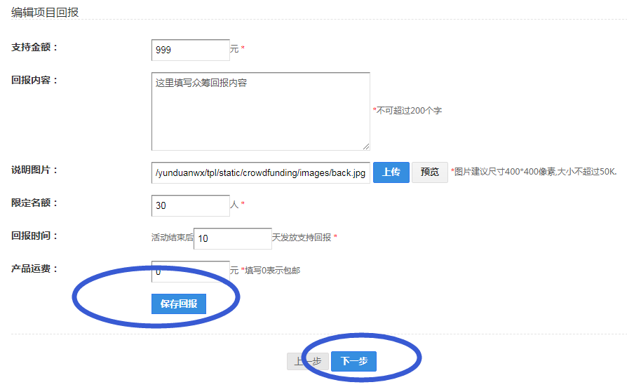 3、过入众筹活动编辑页面,首先对当前众筹活动的基本信息填写完整,有不了解的可以查看设置字段项目后的提示说明,保存后再点击下一步后,便可以进入下一步添加项目回报说明。(下图)