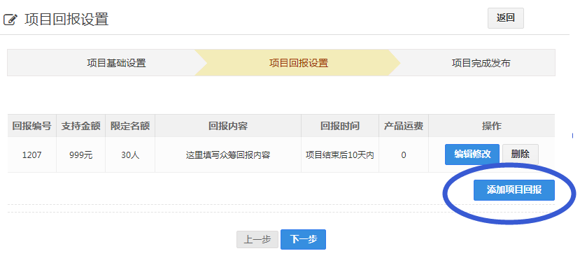4、进入项目回报说明,点击“添加项目回报”按钮,便可以完善当前完成项目众筹之后所获得回报的说明,同一个众筹项目里允许添加多条项目回报,项目回报的作用是向支持众筹者回馈项目成功后的成果。当所有的内容都添加完善之后,点击下一去,便可以正式发布众筹项目了。(下2图)