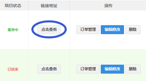 5、当众筹项目添加完成之后,便可以在项目列表中查看到活动的链接地址,可以将此链接地址放置入公众号的自定义菜单、微信推送图文、或者直接生成二维码放置于各种用户入口中即可。(下图)