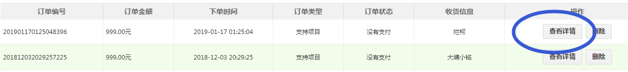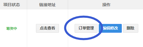 8、当手机端参与众筹者提交众筹订单后,项目后便可以在微众筹后台的订单产管理中查看到提交上来的各个订单,点击查看详情便可以查看每个订单的具体众筹人的项目(产品、服务等)回报信息。(下2图)