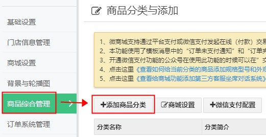 4、在“商品综合管理”,点击“添加商品分类”,这里所添加的分类是指当前商城的一级主分类。如下图:
