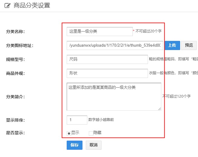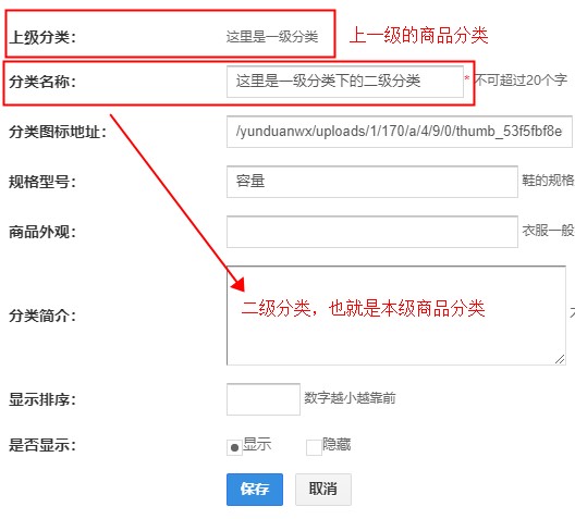 8、再点击“添加商品分类”,重复添加一遍分类信息,在添加下级分类时,设置页面中会显示出当前分类是属于那个上级(父级)分类的名称,以便管理员查看了解。如下2图:
