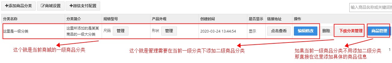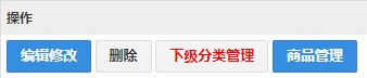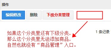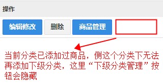 如果某个分类下还添加了下级分类,那么当前这个分类中则没有“商品管理”按钮。如果说这个分类中已添加过商品,那么这个分类下就不能添加下级分类了。如下3图:
