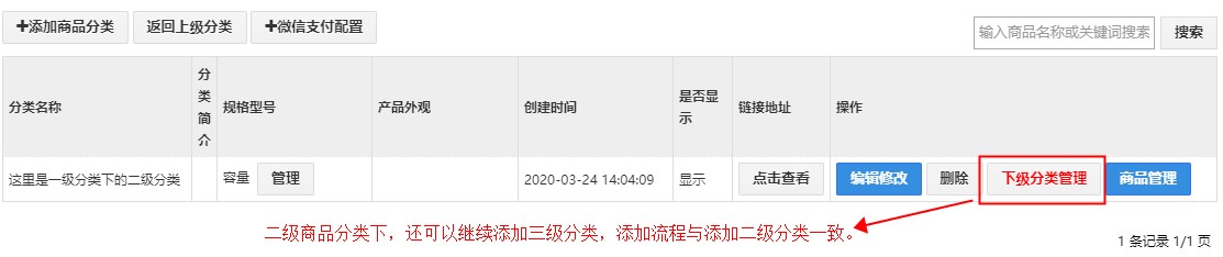 7、当前分类下需要添加下级分类的话,点击“下级分类管理”按钮。如下图: