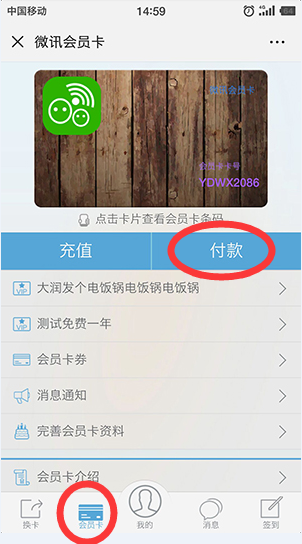 首先微信用户需要进入商家公众号内的会员卡中,在会员卡中点击“付款”按钮。(下图)