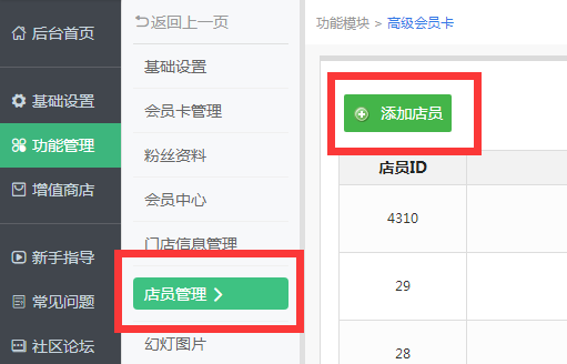 那么这个店员用户名和店员密码是从哪里添加的呢,这个需要到软盈的后台高级会员卡功能中去添加。(下图)