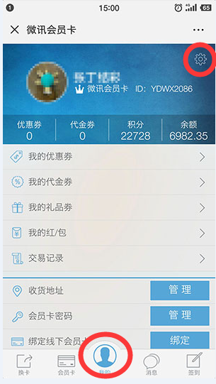 首先让会员在微信端进入公众号的会员卡功能中,当然这个前提是微信用户已经在公众号里领取过会员卡,然后在会员卡功能页面中点击“我的”,同时在右上角找到小齿轮图标(设置)按钮,点击进入。(下图)