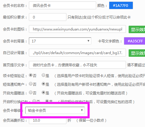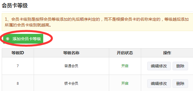 重要提示:会员卡等级是按这里添加的先后顺序来定的,而不是根据你所添加的名称来定的,所以等级超后添加的会员卡等级就越高。相当于等级ID越高对应的会员卡级别也就越高。