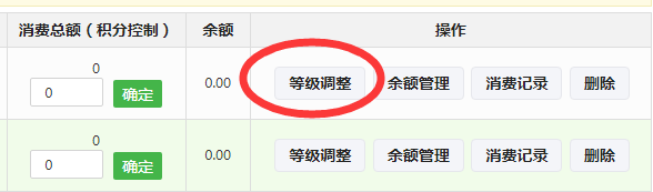 进入到综合管理之后,通过搜索找到某个会员之后,这个会员的操作项目中,点击等级调整按钮,便可以对这个会员进行所属的会员卡调整。如下图所示: