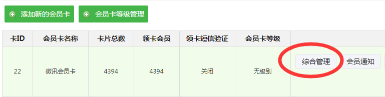 那如何对某个具体的会员进行会员卡等级的调整呢,可以在会员卡管理中,找到综合管理,点击进入,如下图所示: