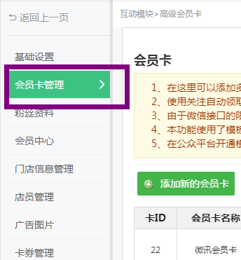1、首先我们进入到会员卡功能,在左侧菜单栏中,找到“会员卡管理”,当然我们在讲解这些设置的前题是您已经添加好了会员卡了!如下图所示: