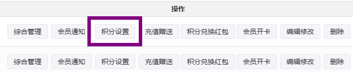 2、在操作栏中,找到“积分设置”按钮,点击并进入设置。如下图所示: