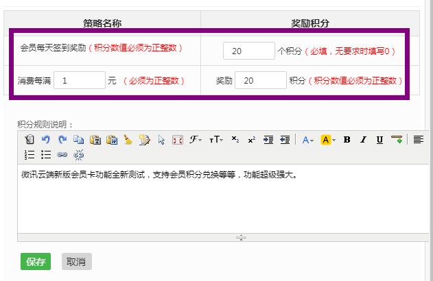 3、进入到积分设置页面,就可以看到会员每天签到可以获得的积分数,以及通过会员身份进行消费得到的积分数。请注意设置页面上的红包文字,在填写时务必不能乱填写。如下图所示: