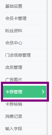 1、首先创建好会员卡,然后在左侧菜单栏中找到“卡券管理”并进入。如下图所示: