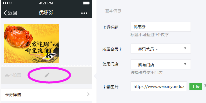 4、进入到卡券的编辑页面,首先需要添加卡券的基本信息,包括卡券名称、属于哪张会员卡使用的,以及可以使用的门店等信息。如下图所示: