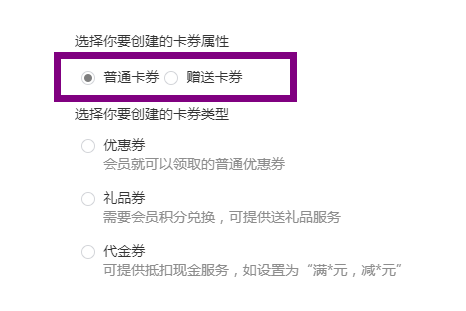 3、我们在创建卡券时,需要注意一下所要创建卡券的属性,这正如文章开头所讲的,卡券分为普通卡券和赠送卡券,这两种属性是有一点区别的,具体的区别会在文未重点说明。具体卡券的类型为别为优惠券、礼品券、代金券。如下图所示: