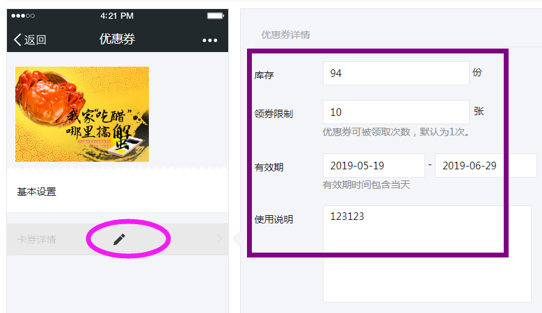 5、然后再添加卡券的详情及使用规规,比如当前卡券的数量、领券次数,这个领券次数是指每个会员可以领几天券的意思。还有这个卡券的有效期限,也就是说这个卡券需要在这个有效期内,才会被显示和领取使用。当然还有这张卡券的具体使用说明等信息。如下图所示: