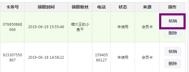 12、门店商家也可以直接在后台领券记录中直接点击“核销”来完成当前卡券的使用状态,如果门店有扫码枪,直接通过扫码第10步里的条码或手工输入卡券号,确定后便可以核销卡券的状态了。