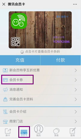 6、当卡券创建添加完成之后,那我们在手机端应该如何去查看会员卡的卡券呢,那下面就是关于手机端会员卡里如何领券的介绍。首先需要在微信端进入到会员卡,当用户领用了会员卡之后,在页面底部菜单中点击“会员卡”,然后就可以在会员卡中找到“会员卡券”入口。如下图所示: