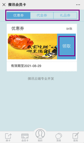 7、进入到会员卡券页面,就可以看到三种卡券,分别是优惠券、代金券、礼品券,如果您所创建的卡券还不是在有效期内,那么这里是无法查看到的。只有在有效期内的卡券才会显示在这里,点击“领取”就可以完成卡券领取。所下图所示: