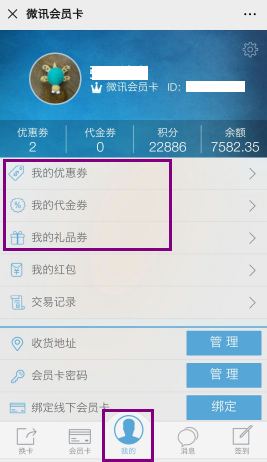 8、当会员领取了卡券之后,在底部菜单中点击“我的”,便可以在我的会员卡中查看到我的优惠券、我的代金券、我的礼品券入口了。如下图所示: