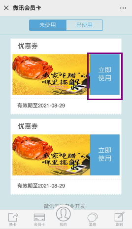 9、在我的卡券里,直接在需要使用的卡券中点击“立即使用”就可以使用掉当前这张卡券了。如下图所示: