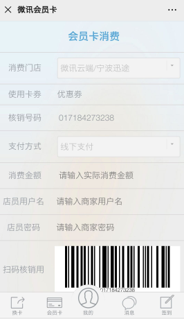 10、手机微信端会员使用卡券后,直接可以在手机端完成当前卡券所属消费门店、卡券类型、卡券核销号码,也就是卡券号的意思,以及支付方式、实际的消费金额。如果门店没有扫码枪那可以通过输入店员名和密码直接完成手机端的卡券核销。如下图所示: