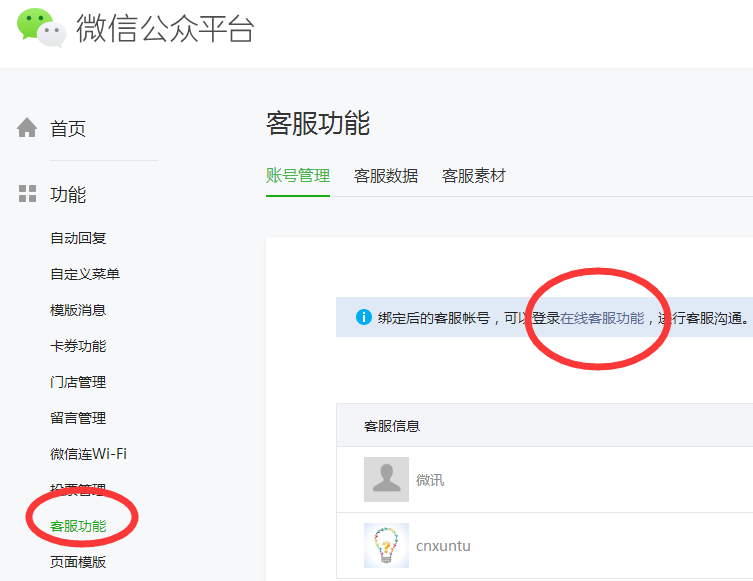 需要使用微信客服功能,首先需要到公众平台去开通客服功能,客服功能可以在公众平台-插件库-客服功能里申请开通。开通后就可以在公众平台中找到客服功能了。(下图)