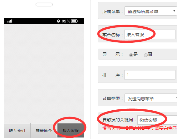 一般情况下,为了方便粉丝快速的进入到微信客服对话状态,可以将微信客服的回复关键词添加到自定义菜单中,这样当粉丝在公众号端点击这个菜单就可以自动接入到对接模式,而不需要手动输入回复客服关键词。(下图)