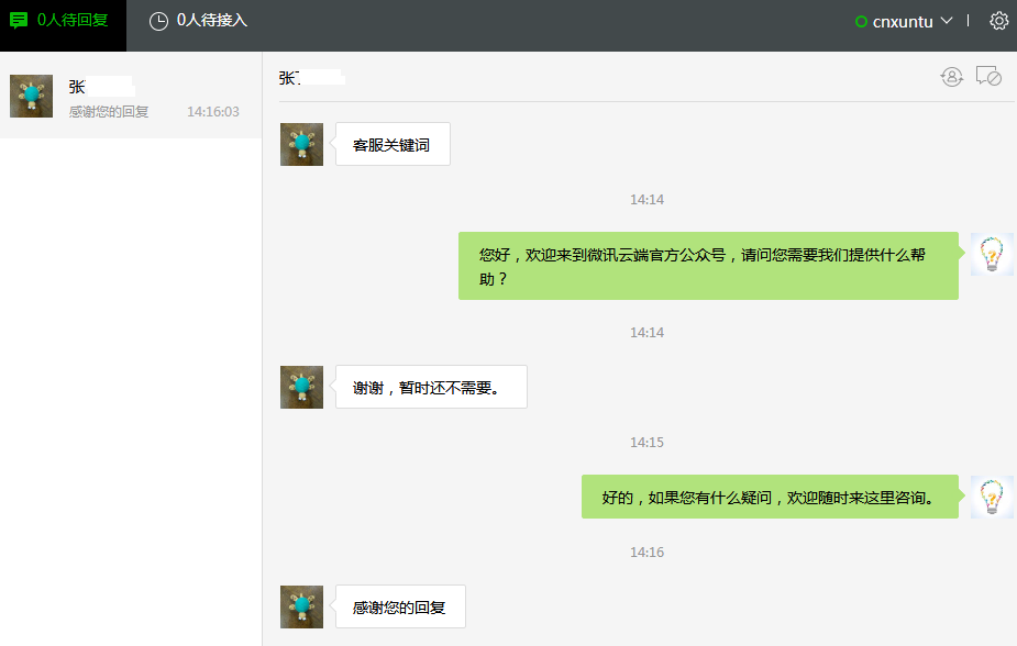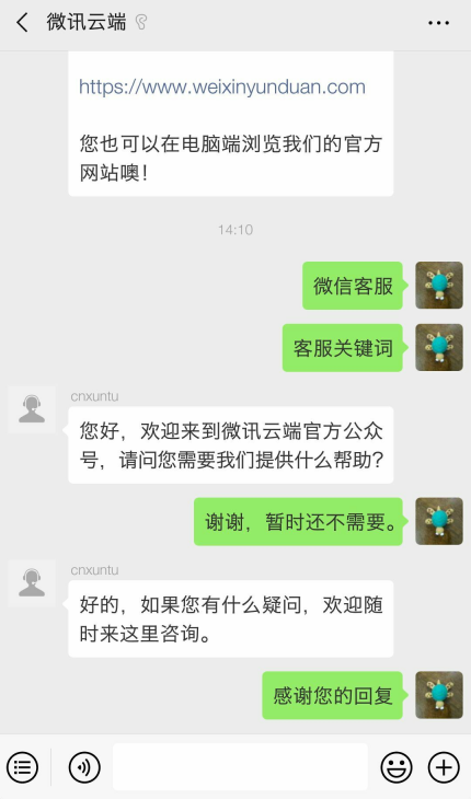 3、当粉丝超过30分钟内没有向客服坐席发送任何消息后,微信将断开粉丝与客服坐席之间的对话模式并退出客服状态。如再次需要接入客服则需要回复客服关键词或点击客服自定义菜单。