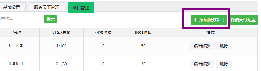 5、进入项目管理后,可以点击右上角“添加服务项目”,需要注意的时如果您所添加的服务项目是需要用户提交支付定金的,那请先去配置好微信支付接口配置。当然在同一个行业预约活动里,是允许添加多个不同的项目,直接添加服务项目即可。(下图)