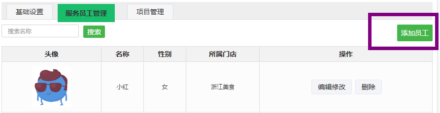 14、进入到员工管理页面后,在右上角点击“添加员工”,就可以添加服务人员了,这里的工员是指向预约者提供服务的工作人员。这里允许被添加多个服务员工的。(下图)