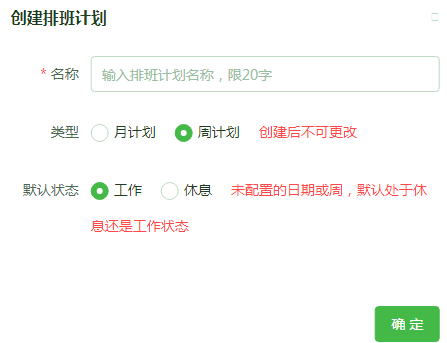 9、在创建排班计划时,需要注意类型,一旦确定好月计划或周计划后,就不能二次修改了。以及当前排班计划的默认状态,具体可以查看红色提示文字。(下图)