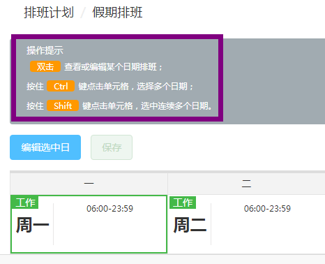 10、 可以在日历格式框中选择日期后点击“编辑选中日”进行编辑,也可以双击查看或编辑某个日期排班,按住Ctrl键点击单元格,选择多个日期,按住Shift键点击单元格,选中连续多个日期。然后进入具体的日期内编辑时间段。(下图)