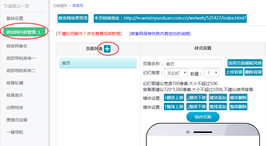 这里直接讲述微官网内容管理这一项,其它的什么基础设置、备份、背景轮播、一键导航之类的非常非常简单,属于一看就会的,这里就不再说明。