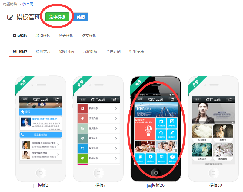 在模板管理中,分为首页、频道、列表、图文这四大类模板,具体选用那种模板看您自己喜欢,一般选择合适的分类,如首页的那就选首页的模板,分类页的就选频道或列表模板,具体的内容文章页就选图文模板。(下图)
