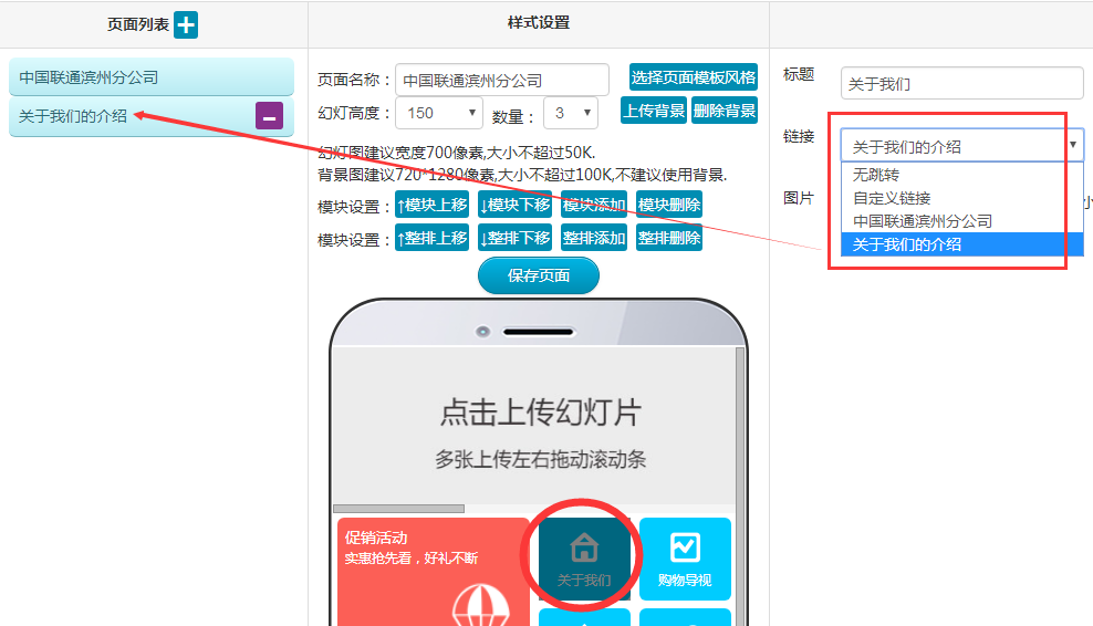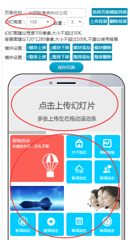 选择好页面模板之后,就可以在手机样式中看到当前的模板样式。如果当前页面需要添加幻灯片,也就是页头的播放图的话,可以在幻灯高度中选择一个高度值,在数量中选择需要添加的轮播图数量,就可以在下方样式中看到幻灯片的位置,怎么添加图片这里就不说了,提示写的清清楚楚了。