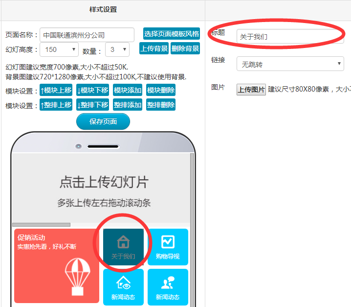 那如何修改模板中的模块和图标等内容呢,很简单呢。先在手机样式中选择某个需要修改的模板图标,选中后,在右侧就可以看到对应的模块标题、跳转链接、图片上传等编辑区了。(下图)